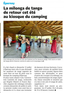 Nous avons reçu la presse locale : le journal L'Union qui a mis en avant ces milongas d'été. En effet, Caminito de Tango, Francis Bauchet et moi-même nous retrouvons aussi les dimanches 27 juillet, 10 et 24 août de 15h à 19h sous ce beau kiosque au bord de la Marne. Il y fait toujours bon, quel que soit le temps extérieur. Et pour tous ceux qui veulent se restaurer et se rafraîchir, il est possible de se rendre au Pop-Up Restaurant qui jouxte la milonga. C'est un plus indéniable l'été !